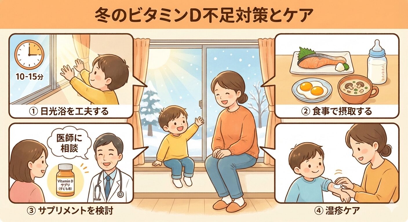 不足が心配なら、医師の指導でビタミンDサプリ(子ども用、1日400-1000IU程度)を考慮。